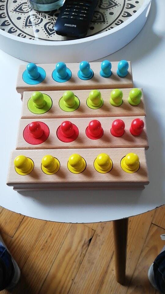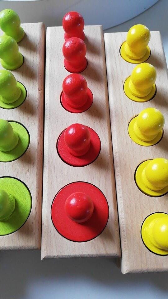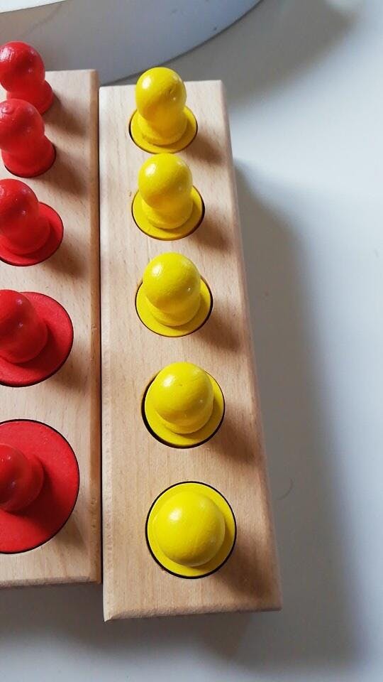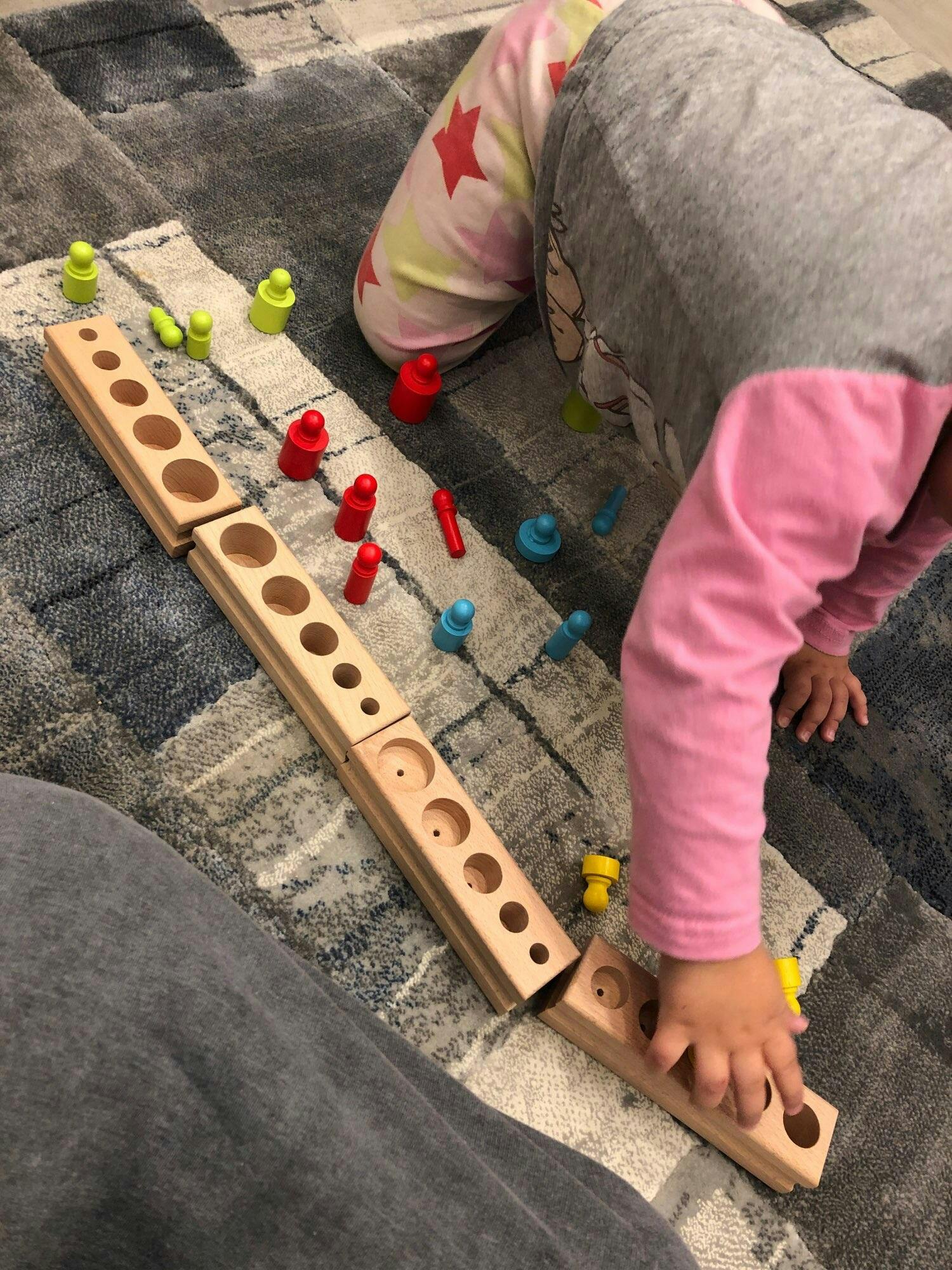 - Samoopravování: Pokud je válec vložen do nesprávné díry, poslední válec se nevejde. To umožňuje dítěti samo opravit svou chybu bez pomoci dospělého.