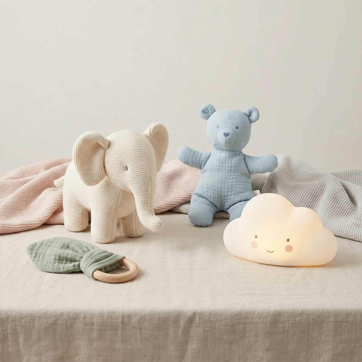 부드러운 봉제 친구로 시작하고, 진정 효과가 있는 부드러운 소리 장난감을 추가하며, 휴대 가능한 감각 딸랑이를 포함하세요—모든 상황에 대비한 편안한 3종 세트입니다.