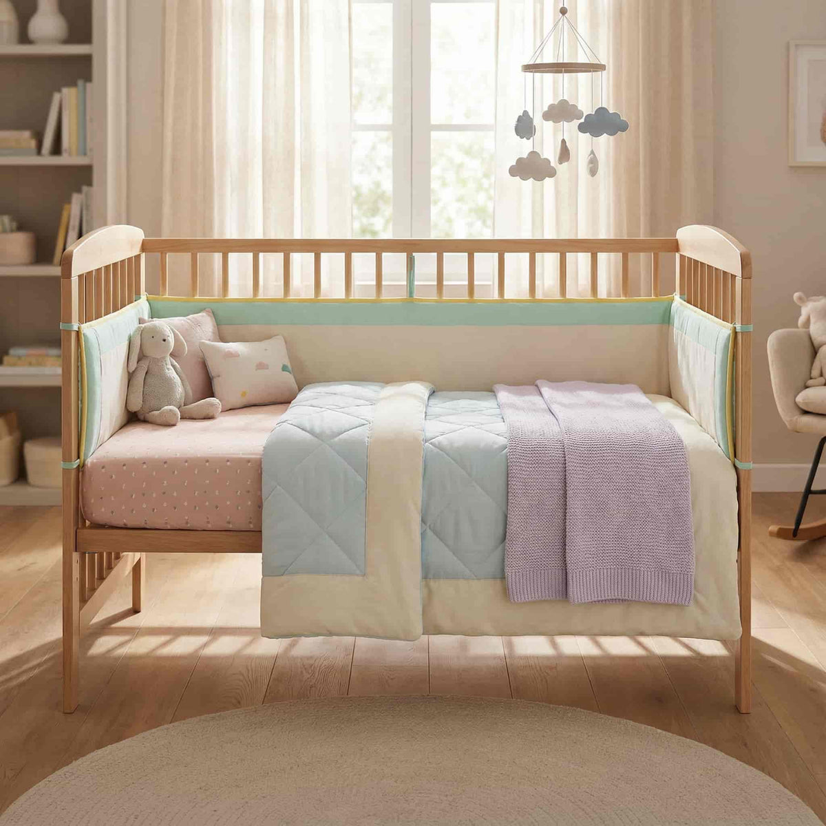 - 완벽한 아기 침대 세트: 범퍼, 맞춤형 시트, 퀼트, 담요로 조화로운 룩 완성.