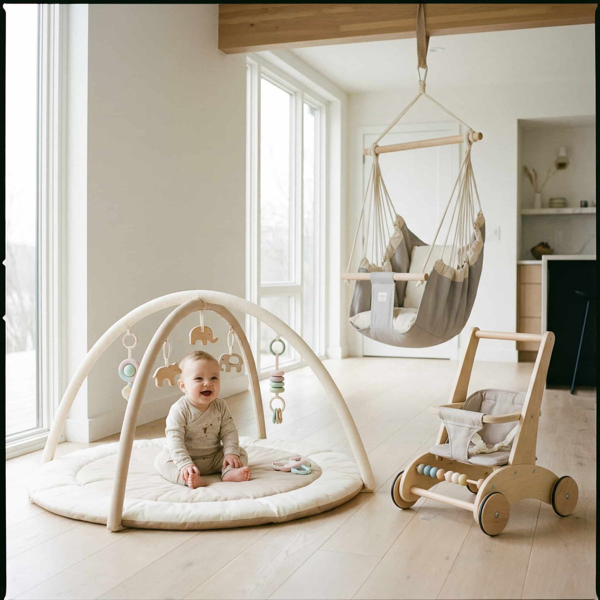 접이식 활동 체육관과 안전한 하네스 그네, 미끄럼 방지 보행기를 함께 사용하여 아기가 자신감과 이동성을 키워가면서 성장에 맞춘 완벽한 활동 놀이 환경을 만들어 주세요.
