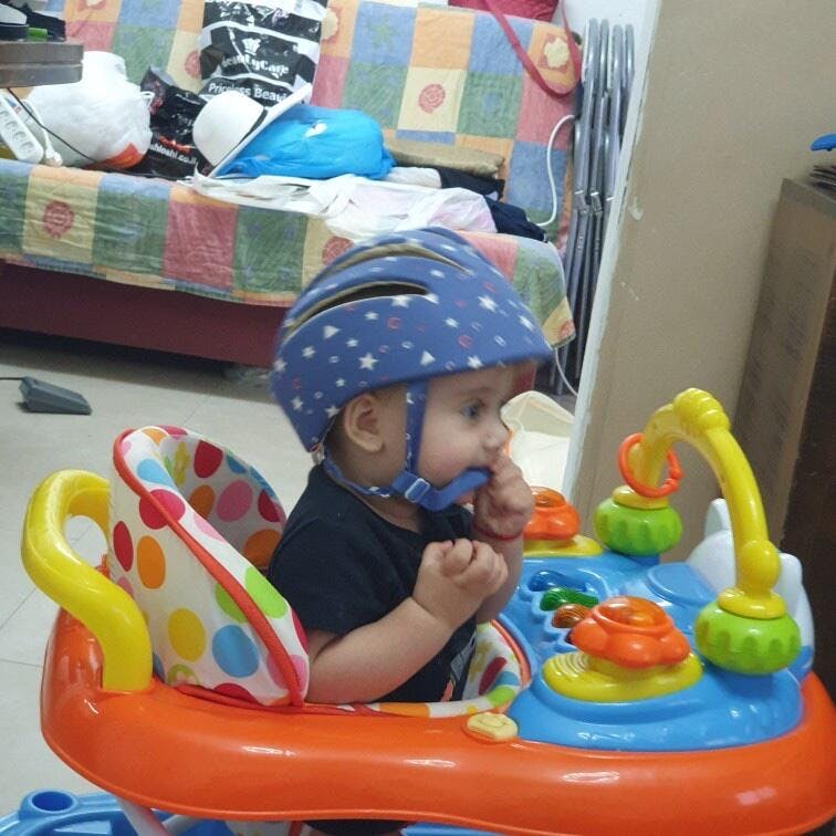 Crawling: Protects the forehead when baby bumps into table legs.